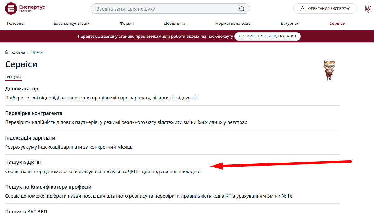 Сервіс «Пошук в ДКПП» ми розмістили у розділі «Сервіси».