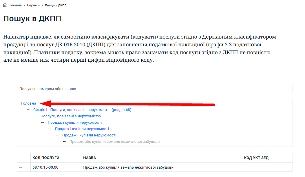 Пошук необхідного коду послуги можна здійснювати безпосередньо, переходячи від одного рівня (однієї назви) класифікаційних угруповань до іншого (іншої).