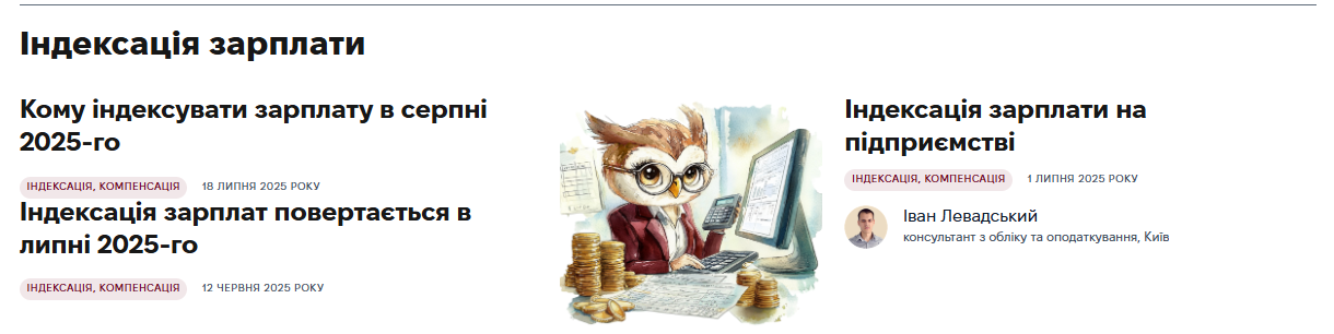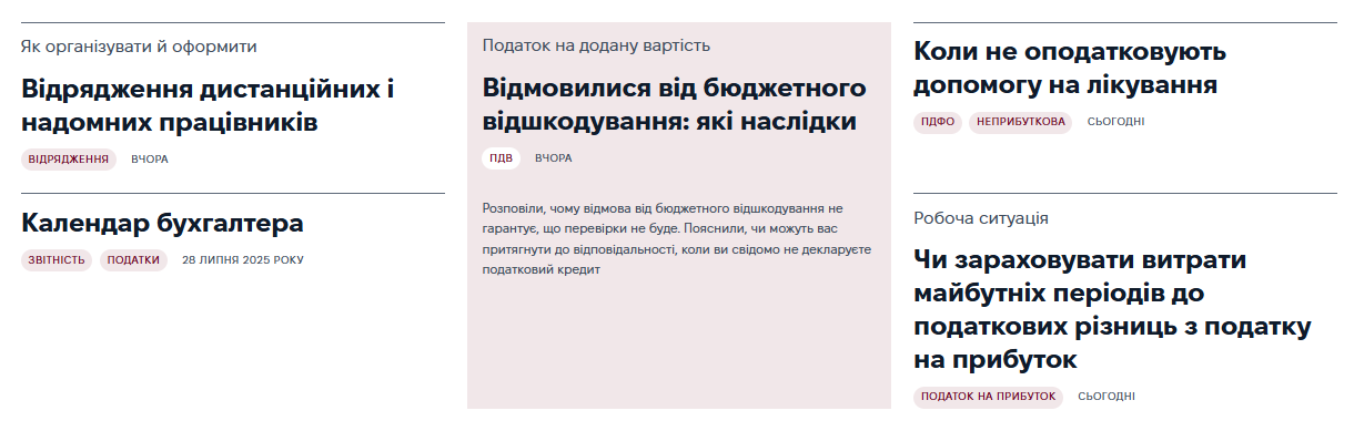 Головна сторінка системи містить не тільки найновішу інформацію. На ній знайдете також тематичні блоки, які містять по три консультації на важливу для бухгалтера тему: