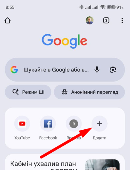На стартовій сторінці Google Chrome натисніть на кнопку «Додати» під пошуковим рядком: