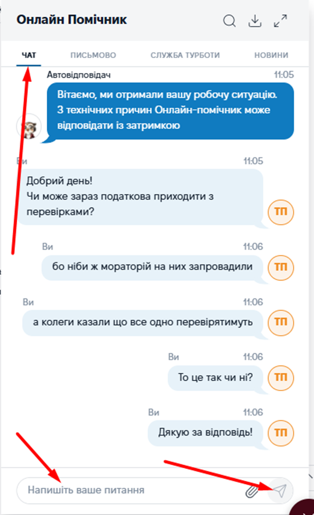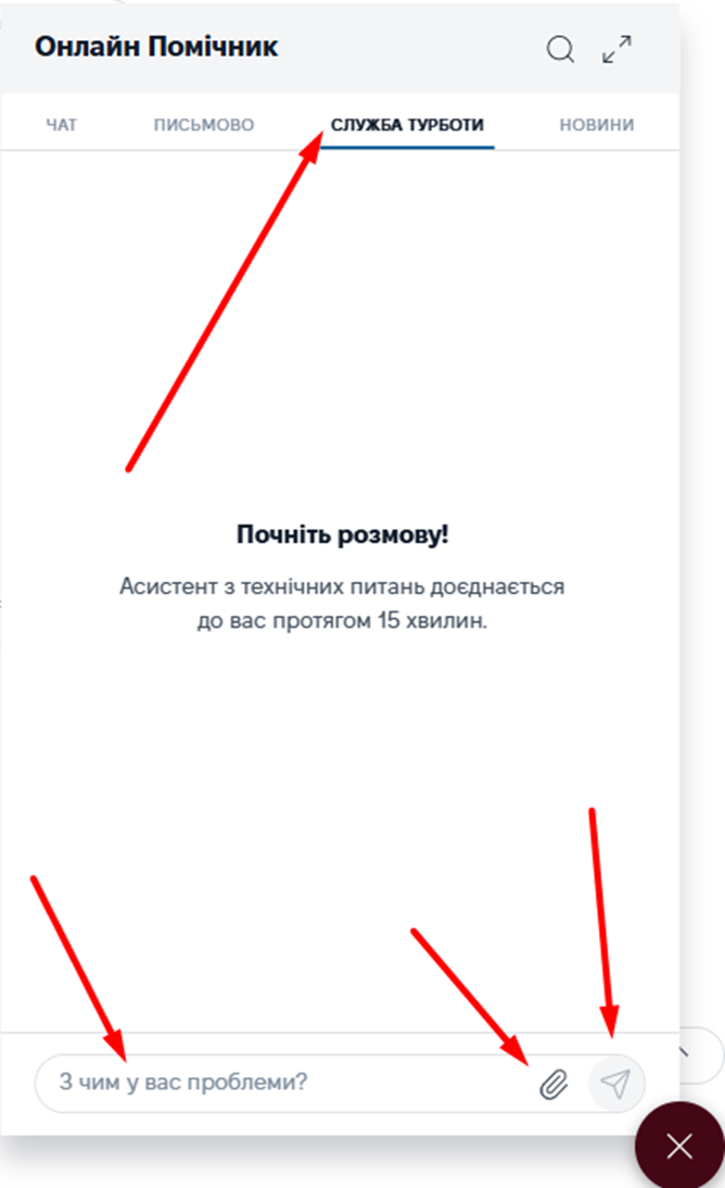 2. Для того щоб надіслати своє звернення в чаті, напишіть його в порожньому рядку й відправте за допомогою значка, позначеного на скріні нижче.