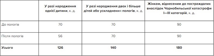 - після пологів — 56 к. д., починаючи з дня пологів (70 к. д. — якщо народилося двоє і більше дітей та ускладнені пологи).