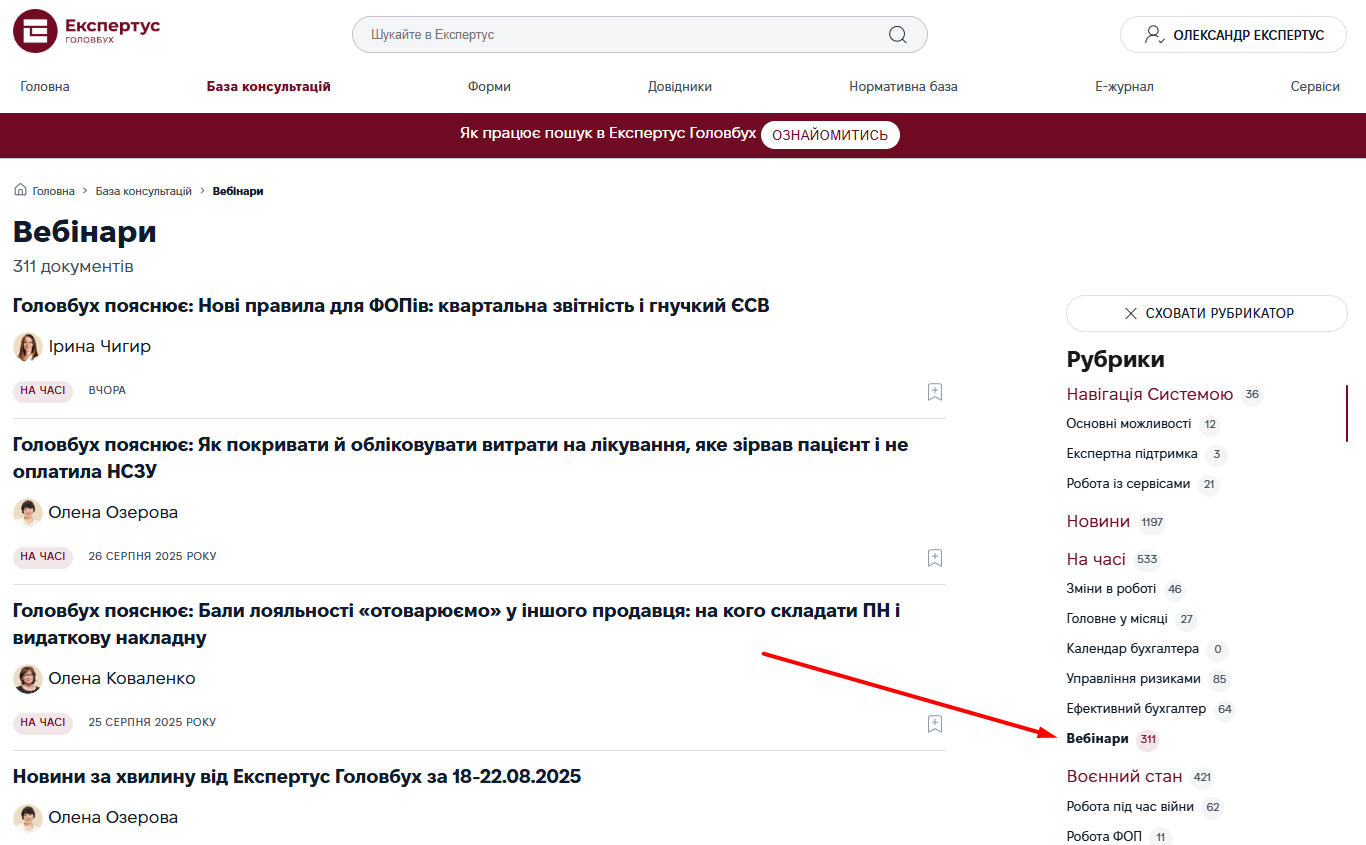 Постійні відвідувачі системи вже помітили, що у новому Експертус Головбух немає розділу «Вебінари». Не переживайте, відеороз’яснення не пропали! 😊 Тепер вони живуть у розділі «База консультацій», у підрубриці «Вебінари» рубрики «На часі»: