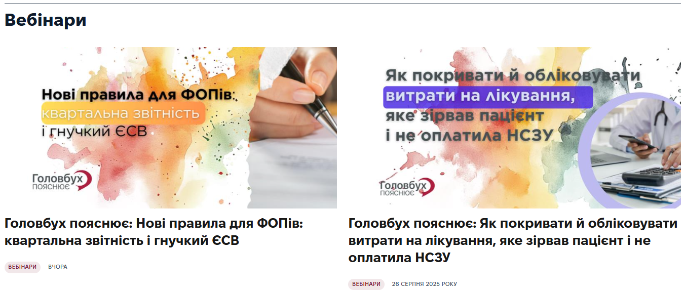 Про майбутній найближчий вебінар від Експертус Головбух також завжди можні дізнатися зі стартової сторінки системи. Він розташований в такому блоці: