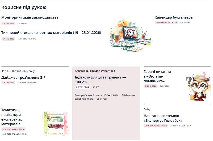 - Тижневий огляд експертних матеріалів — найважливіші консультації, статті, відеороз’яснення, опубліковані в системі «Експертус Головбух» упродовж тижня. Класний інструмент для тих, хто не має часу заходити щодня.